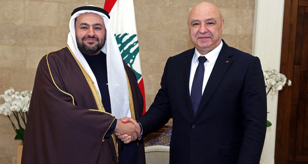 Lebanese President Joseph Aoun (R) shaking hands with Qatari Minister of State Mohammed Bin Abdulaziz al-Khulaifi after their meeting at the Presidential Palace in Baabda, east of Beirut. AFP