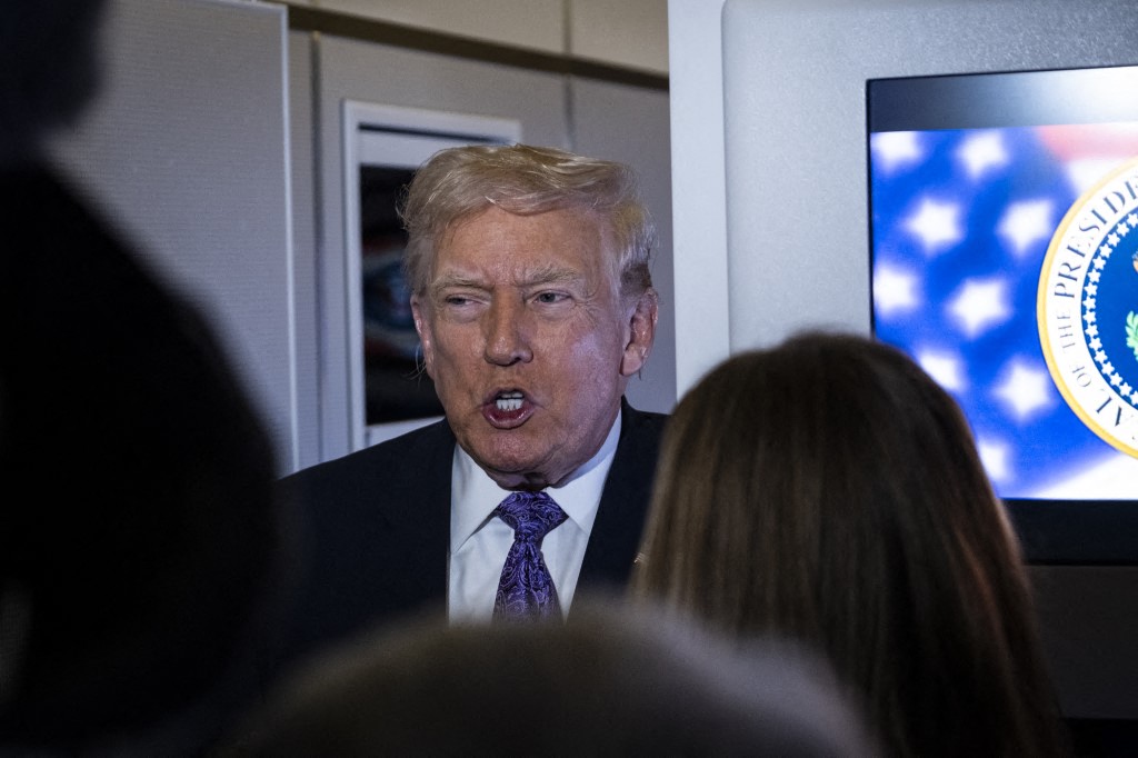 President Donald Trump speaks to the press aboard Air Force One en-route to Washington, DC on November 30, 2025. AFP